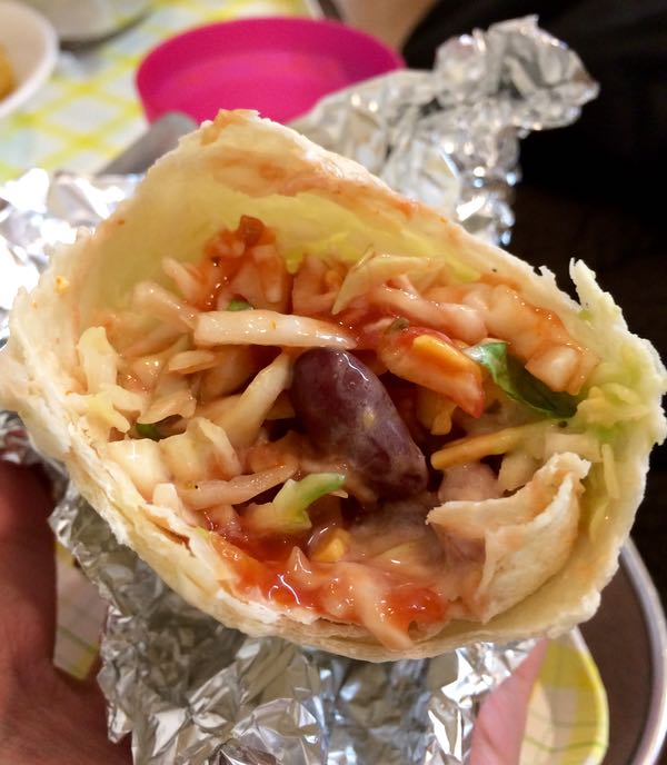 タコス同様のずっしり感! チリビーンズがいいですよぉ〜〜。一見タコスとの違いがわかりにくいかもしれませんけど、大きな違いはライス入りかどうかです。ブリトーはライス入りなので、タコスよりもグっと腹持ちがいいです![]()